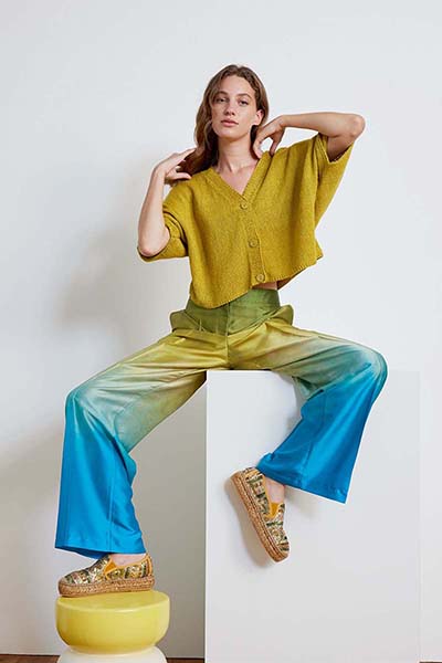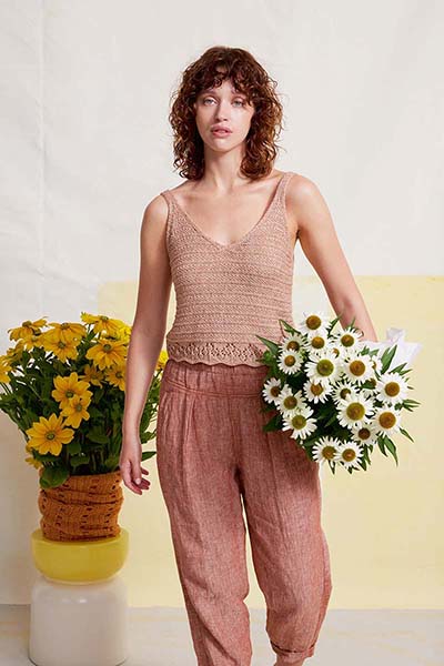 Denken Sie an schlichte, leichte Pullover mit hochwertigen Details, körperbetonte Trägertops aus sommerlichen Garnen sowie High-Fashion-Stücke mit auffälligen Farben und dreidimensionalen Texturen.
