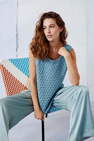 Filigrane Loch- und Spitzenmuster aus leichten und luftigen Garnen dominieren den LIQUID LIGHT Teil unserer Kollektion. Inspiriert von Licht, das sich auf stillen Wassern spiegelt, und dem kühlenden Nass an einem sonnigen Sommertag, sind die Farben in einer breiten Palette von Blautönen sowie sommerlichem Orange und zartem Gelb gehalten.